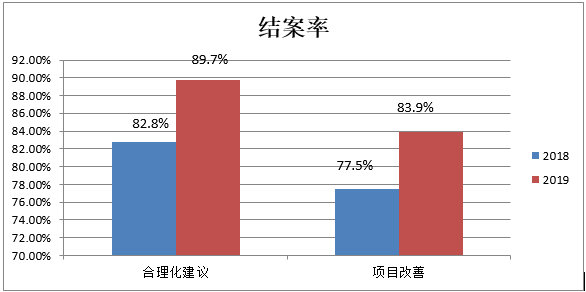 今年截止9月份,合理化建議共接收并被采納39項,結(jié)案35項,4項還在如期進(jìn)展中,結(jié)案率89.7%,改善項目立項31項,結(jié)案26項,5項在如期進(jìn)展中,結(jié)案率83.9%。同比去年的合理化建議結(jié)案率82.8%和項目改善結(jié)案率77.5%提升不少。